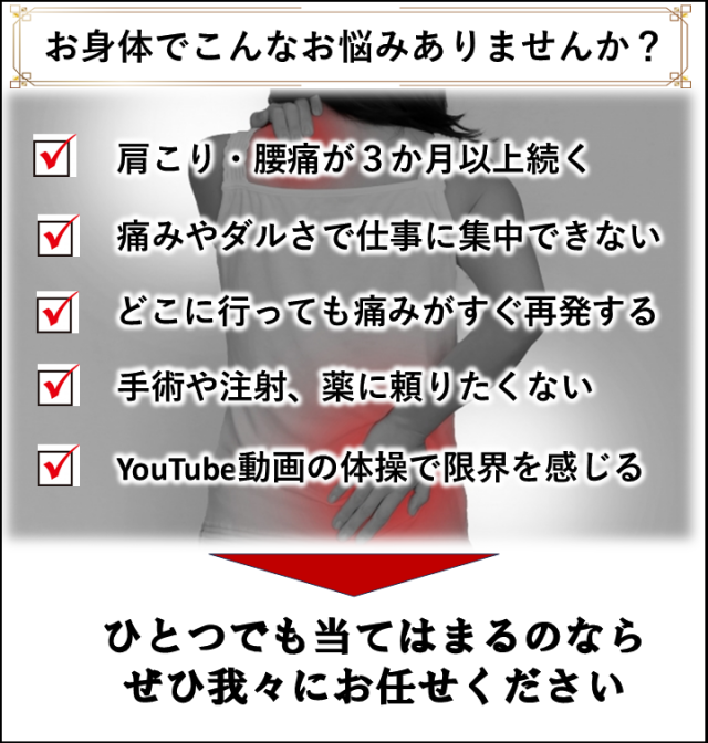 10年ほど前から慢性腰痛があり、仕事が忙しくなると激痛が続いていました。